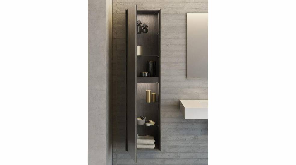 Întreaga colecție a fost creată pentru garantarea confortului și calității maxime, sertarele fiind un exemplu, cu un sistem de extragere complet și un interior împărțit în compartimente, cu un finisaj texturat în lemn întunecat, foarte plăcut la atingere, și un sistem de închidere amortizată și silențioasă, sau unitățile coloană, cu iluminat interior, polițe de sticlă și oglindă completă.