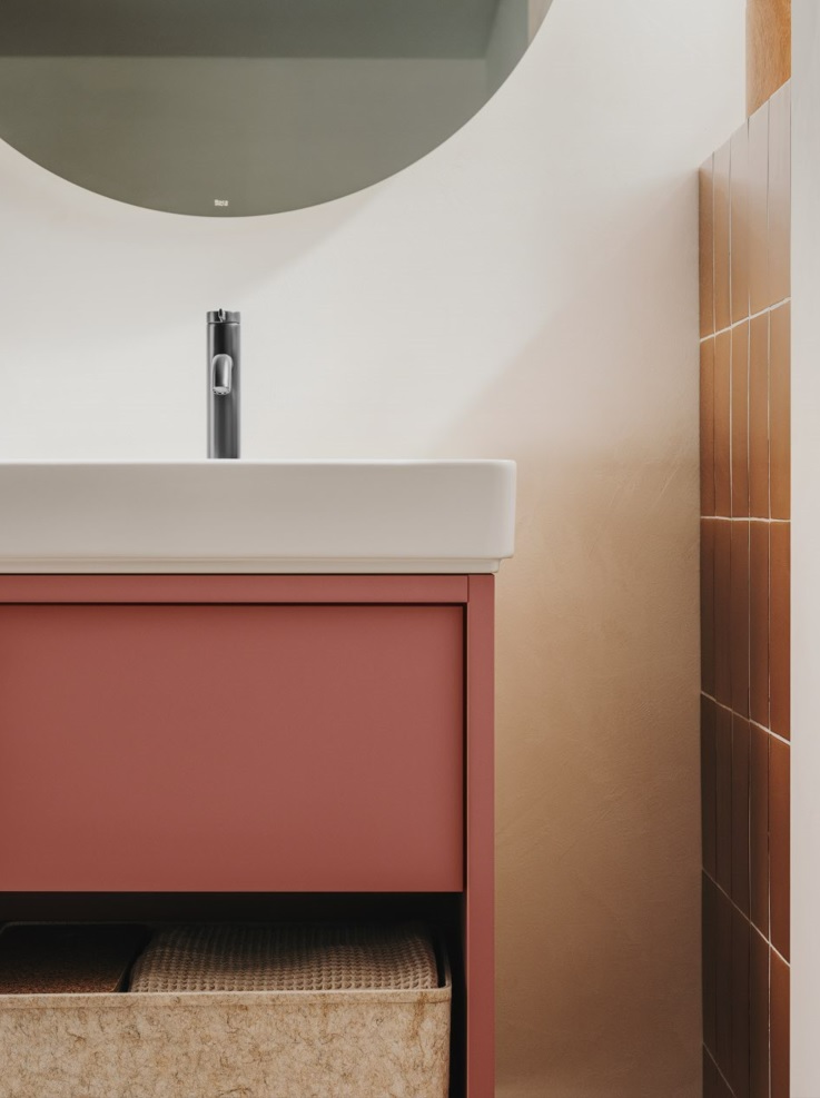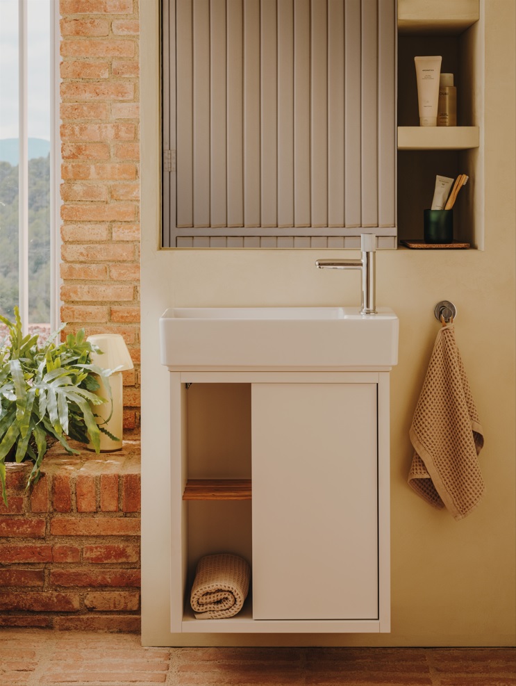 Mobilierul Tura este un exemplu de sinteză arhitecturală, deoarece se integrează perfect cu lavoarele. Concepută folosind linii drepte, spații goale și forme foarte simple, colecția este disponibilă în trei finisaje: off-white, light noble grey și light terracotta. care, ca și celelalte două, este la fel de discret și natural.